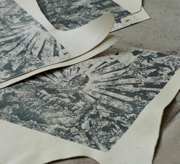 レザーブランド創悦では、この迫力ある挿絵を、ナチュラルレザーの上に精緻に再現。シンプルなフォルムの中に物語が息づき、日常のアイテムでありながら美術品のような存在感を放つレザーアイテムを製作しました。手にすることで、北斎の大胆な構図、細やかな表情描写、そして物語世界の力強さを直に感じていただけます。